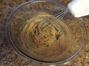 将室温软化的黄油加入红糖和白砂糖,用蛋抽使劲画圈搅拌