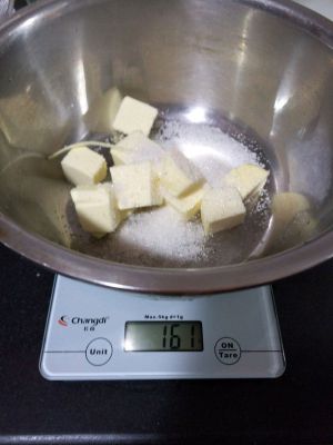 黄油切块,室温软化(黄油不需要太软,手指稍微用点力可以按下即可)
