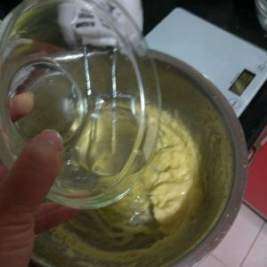 分两次将蛋清倒入,并搅拌均匀,打至发白