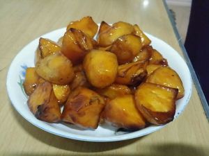 勺内加花生油烧至90℃时,把地瓜块放入油内炸熟透至色泽金黄色时捞出控油。