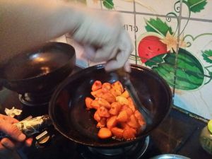 慢火熬制糖浆待糖变色变的比较深色时放入地瓜迅速翻炒