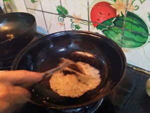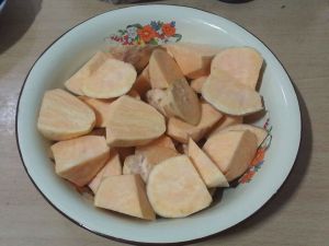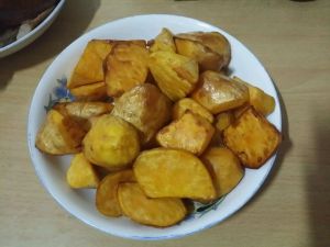 锅内放适量油开火烧热,以竹筷插入,见四周冒细泡时,将地瓜倒入煎炸至金黄色。