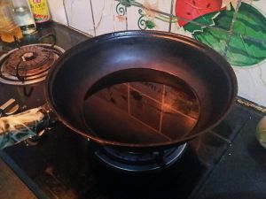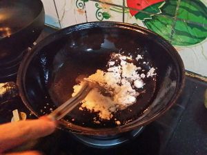 倒出锅内的油,留少许余油,加入白糖和小半碗清水,煮沸。