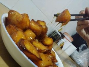 我是用水熬的糖,水少放一点点就可以,糖熬成黄色在放入地瓜