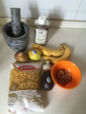 意面加盐煮开,至于煮多长时间得看一面的大小来决定。最简单的方法就是,边煮边吃。煮到没有硬芯就好了。煮好的意面泡在冷水里。最后用凉白开冲洗一遍,沥干拌入橄榄油。煮意面时各种水果切丁切块。最后加蜂蜜和番茄酱,撒上坚果碎拌匀就能开吃了。