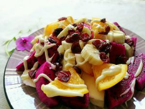装盘,淋上色拉(我用的是香甜口的)。再放上一些蔓越莓干就可以啦