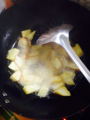 小火把地瓜炸成图片颜色,用筷子插进去看看里面熟没熟,,熟了就拿出来,把剩下的油倒出来。把锅烧热,当豆油,油开了,小火放糖,小火慢慢熬成枣红色,大火把地瓜放进去,翻滚几下出锅。