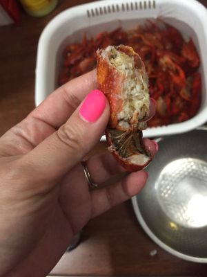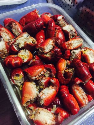 撩出煮好的小龙虾在净水里洗干净,我换了二次净水后,水已经变得清澈,并且温度也降低了(降温是关键)