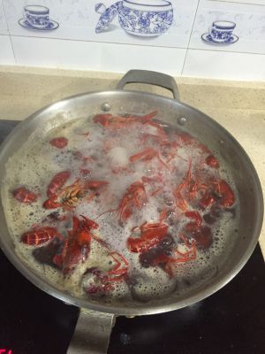烧水时候加入姜片,水沸腾后倒入小龙虾然后加入适量的料酒