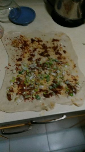 然后抹上五香面 辣椒面 盐 把绞肉铺好 葱花放一半 这个位置一会儿好弄 不然就会漏出来