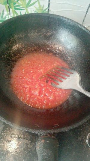 番茄酱炒匀后,加多一点糖,少许醋。放菠萝丁翻炒。