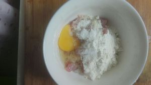 拌成鸡蛋面糊。面粉可以不用一次加太多,觉得稀了再往里加面粉就好。如果一次加太多,干了就囧了。。因为加水不太好。粘稠程度的辨别方法是,把筷子放在里面再拿出来可以挂在筷子上,而且用筷子搅拌有轻微的阻力就好。