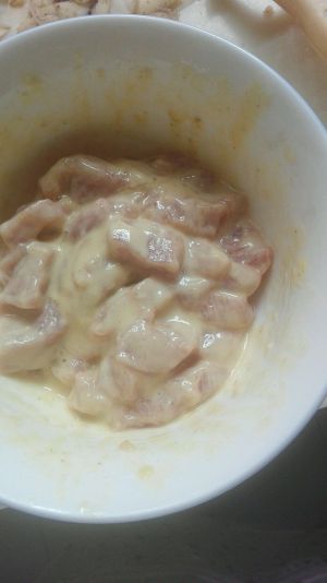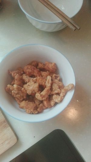 腌制好的肉片先裹一层面糊,再放入干面粉中压一层干面粉,抖掉多于的面粉后当油锅炸(闲麻烦可以省略),油温不能太热