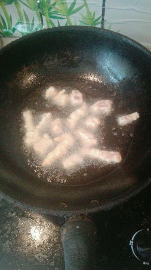 油锅内倒入油,开中大火,烧至八成热转中小火,逐个下入里脊条。 炸定型后捞出