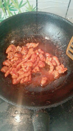 放少量油,油不要太热,放糖和番茄酱,稍用油搅拌一下,放水,开大火,最后再放水淀粉,有点稠后,放肉