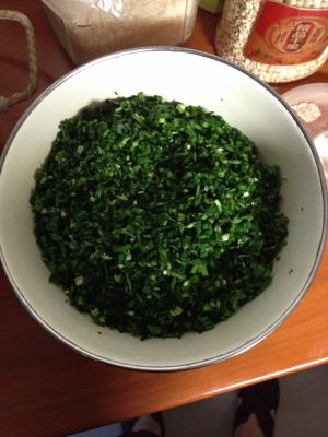 这期间准备馅料,韭菜切碎,提前泡发的粉丝切碎,鸡蛋炒好后倒入韭菜粉,不要炒的太熟