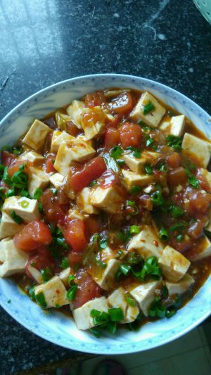 锅中放适量油,烧老,倒入姜蒜,再加豆瓣酱,放入葱头,然后将番茄下锅翻炒均匀,然后加少量水,待水开后将豆腐倒入锅中,轻弄匀,煮2~3分钟放入鸡精,勾芡,撒上葱花,起锅,