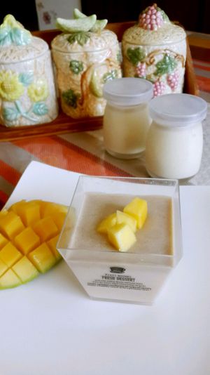过滤后的牛奶分装后冰箱放置4小时,凝固后把颗粒芒果放表面就可以了!