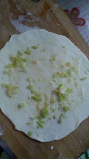 第三,和面揉几个回合,擀面杖擀出面皮,撒上葱油,小葱切碎撒在面上。