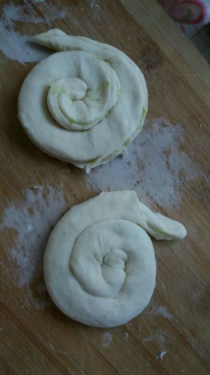第四,面皮卷好,平均切开,顺着方向卷成圆圈。用擀面杖擀平。