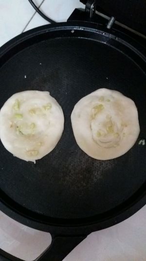 第五,电饼铛抹点油,饼上撒葱碎和食用油。开始加烤。