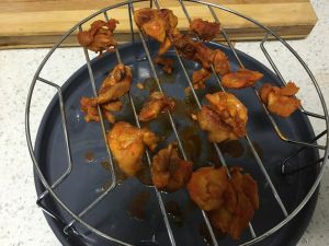 买来鸡腿肉,先用热水焯下去,去血水,之后用酷克100的奥尔良烤鸡翅料腌制30分钟,之后用微波炉的烤翅功能烤熟,一般20分钟左右,切记微波炉如果没有光波的话,是不能用金属烤架的。你家微波炉如果有烤翅功能,一定要用金属器皿,因为烤翅用光波,不是微波。