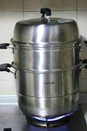 蒸锅中放入适量冷水,打开煤气大火开始蒸,水烧开锅后,改中小火蒸10分钟左右关火,关火焖3分钟左右出锅。