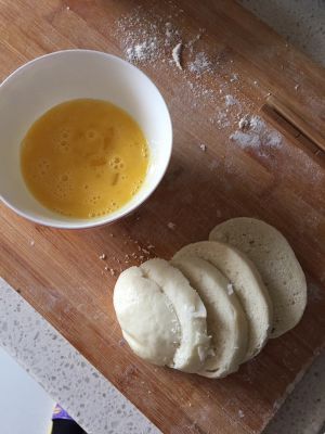 大馒头切半。 尽量选择大的北方老馒头,太软的话成型效果不佳。