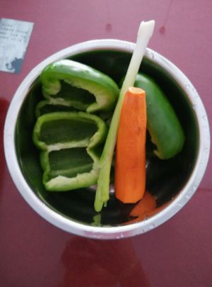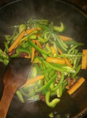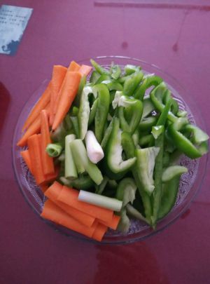 先炒五花肉至金黄出油 再放葱段 放红萝卜 最后放青椒