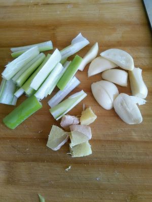 准备辣皮子,葱段,姜片,蒜块,八角,桂皮,花椒,草果,香叶