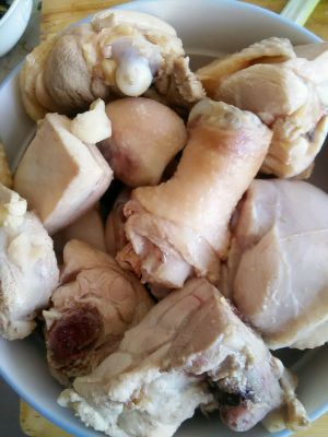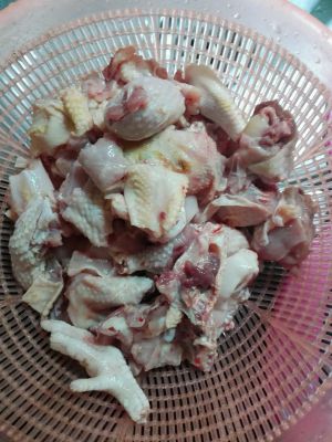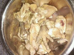 剁好的鸡块在清水里焯5分钟,捞出来控净水,备用