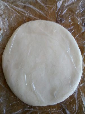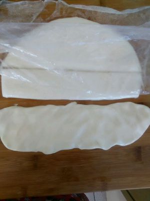 这时面已经醒好了,再揉几下,擀成一指厚的饼,两面摸上油,用保鲜膜盖好备用