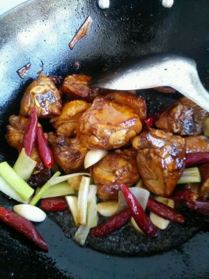 鸡块在锅里翻炒,很快会上色,为了味道好吃,再少放点酱油,放入调料,葱姜蒜,葱和蒜别放完了,留点后面要用,干辣椒,料酒翻炒