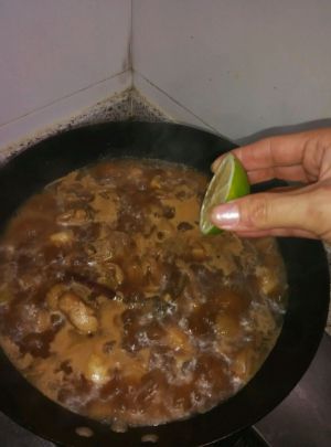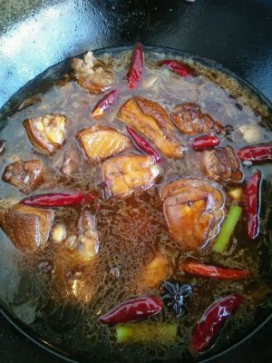 放入鸡块炒出水分,放生抽老抽冰糖上色。加水没过鸡肉大火烧开(一忙活忘记拍照片了)