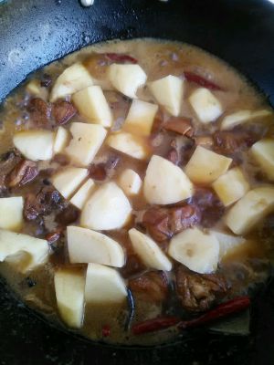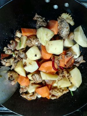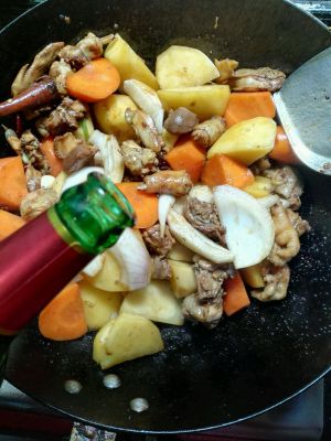 放土豆块翻炒一下,土豆切大一点的块,太小鸡腿没熟土豆就炖化了。加入生抽调味,再放老抽调色。