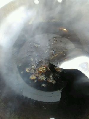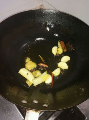 炒至变色后加入八角,桂皮,干辣椒,蒜,葱白,姜。继续翻炒