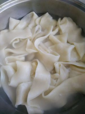 面切成差不多三指宽的条用手压扁,等水开了揪住两头拉成面片放进锅里
