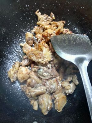 热锅倒油,放入一勺白糖,用铲子搅拌,等锅里冒泡了再放入鸡块