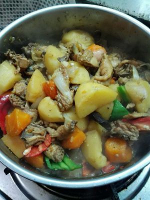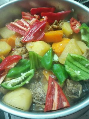 焖煮20分钟后放入切好的土豆块,青椒块和洋葱,再煮十分钟