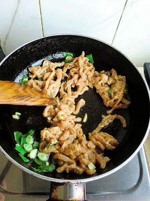 炒锅上火烧热加肉爆炒肉丝,最后可加入少许米酒爆香盛出。