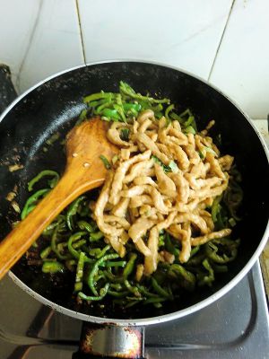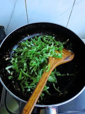 底油放入切好的青椒丝翻炒。