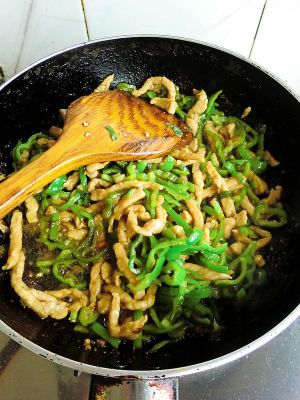 热锅下油炒香尖椒,放入肉丝翻炒再加水淀粉勾芡盛出即可。