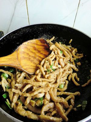倒入肉丝翻炒。