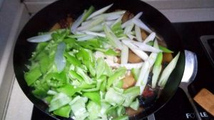 15分钟后,放入切好的青红椒以及尖椒,大蒜以及适量食盐调味,大火翻炒,同时收汤汁;