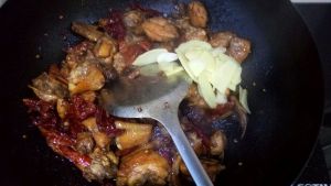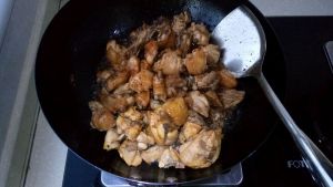 放入沥干水的鸡块炒匀,均匀的裹上糖色,倒入一勺豆瓣酱,翻炒均匀