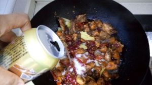 起油锅,油7成热后,放入花椒粒,以及适量豆瓣酱爆香,出香味后,放入鸡块爆炒直至鸡皮变成金黄色,随即倒入一整罐爱尔兰黑啤,放入适量生姜片,盖上锅盖,大火焖5分钟;