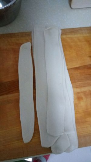 用擀面杖将一半的面团擀平,裤带面不需要擀得太薄;