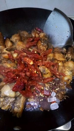 放辣椒 冰糖 花椒 草果 八角(掰成小瓣入味)炒一会儿