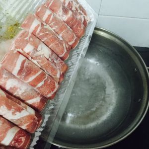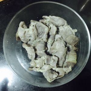 焯牛肉,水开后倒入牛肉片儿,水再次沸腾,肉变白后捞出牛肉片儿。