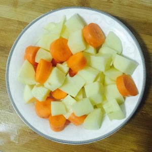 这时候不着急在准备土豆,土豆可以切,也可以用刀奔土豆,这样口感好,更入味,土豆块可以大一些。